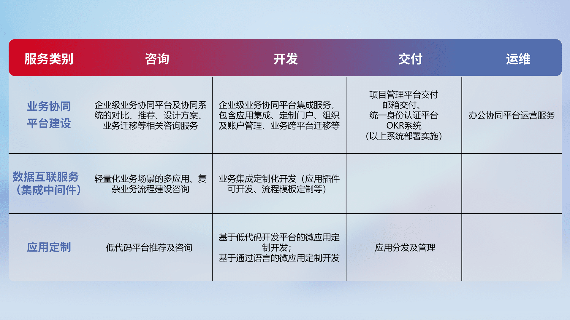 针对钉钉、、、企微、、、IDaas等平台级产品提供产品的规划、、方案、、、交付、、、、定制化开发等服务,,,,实现如统一协同办公、、智能客户服务、、、、混合会议管理、、、智能数据查询、、、等业务场景,,,实现数字化转型。。